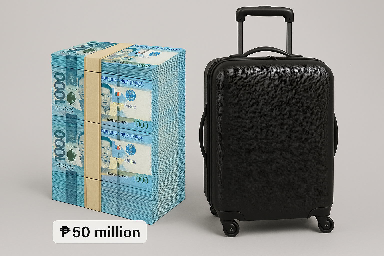 Here’s a visual comparison of a stack of ₱1,000 bills totaling ₱50 million next to a standard suitcase: